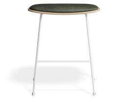 The seat is made from solid American ash, stained black to allow the natural grain to show through. An inset pad in smooth black vegan leather adds everyday comfort, while maintaining the stool’s minimalist aesthetic. A slender 12mm steel rod frame, powder-coated in matte black, gives the piece structure and visual cohesion. Clear glides help protect floors without compromising on form.